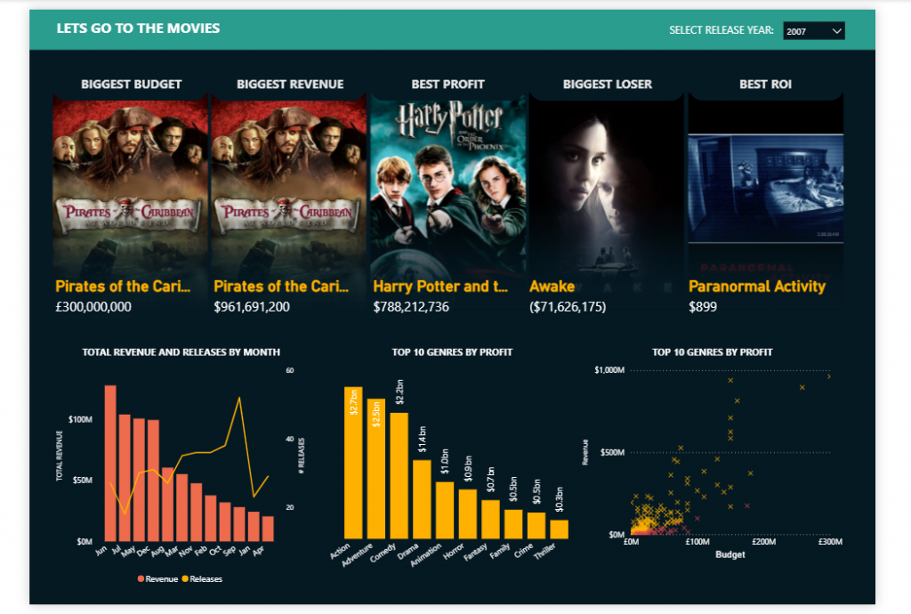 To begin with it was the winning movie by category across the top, with 3 charts across the bottom showing different metrics (but something you’d normally see on a business dashboard). KPIS, EVEY DASHBOARD NEEDS KPIS – so I added some, nothing exciting here just a card with a colour line on the left hand side to bring it into align with the rest of the dashboard.