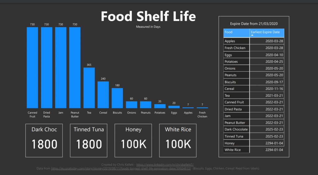 After a trip to the supermarket for a packet of Fig Roll (an underrated biscuit) I got the idea to build a food shelf life dashboard. A quote from the BBC “Retailers say they have enough food and groceries to go round, but they are struggling to get items into stores as fast as people are buying them.” “Buying more than you need means that others may be left without,” said Mr Eustice. “As you shop think of those who are finishing their late shifts and need to pop to their local shops.”